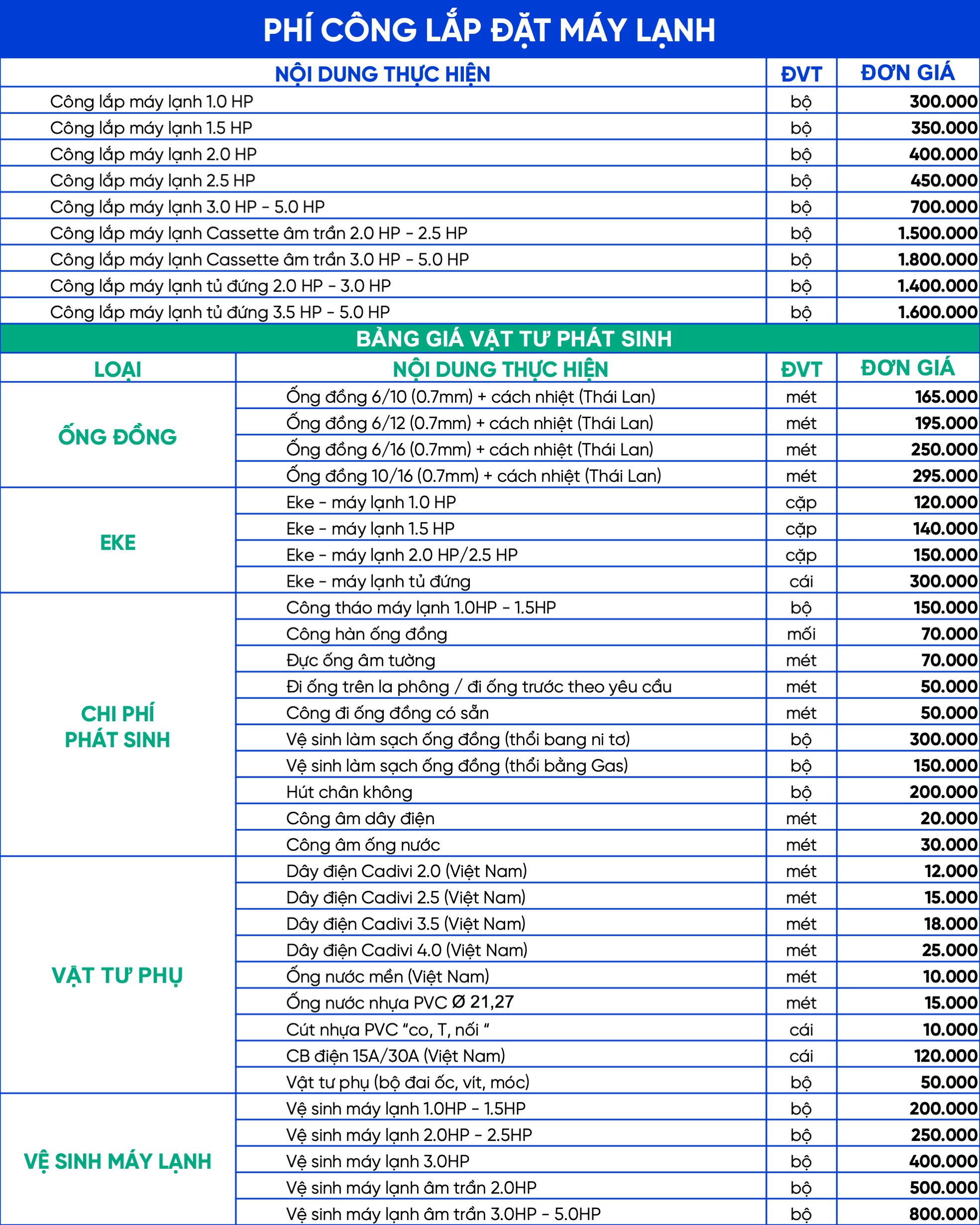 Bảng giá vật tư - Lắp đặt