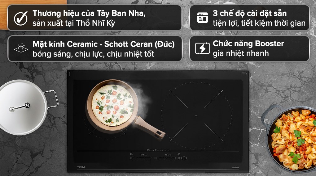- Bếp từ Teka có tổng công suất 3600W, vùng trái 1800/2100W, vùng phải 2100/2500W.