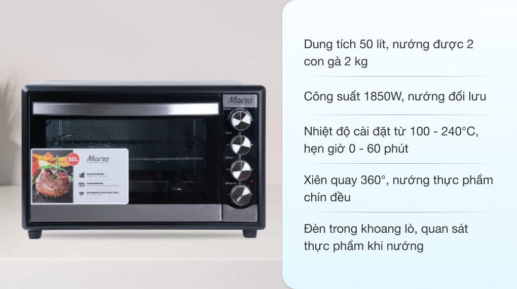 Khả năng tùy chỉnh nhiệt trong khoảng 100 - 240 độ C với 6 chế độ nhiệt khác nhau. Chế độ hẹn giờ lên tới 60 phút, cho bạn dễ dàng định mức thời gian nướng thực phẩm tùy ý.