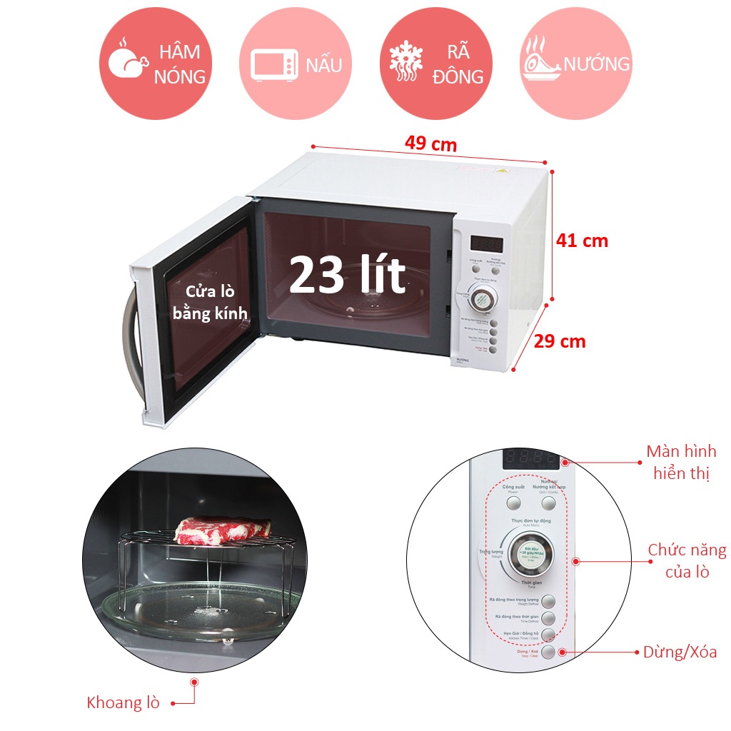 Dung tích 23L, Công suất vi sóng/nướng 800W/1000W