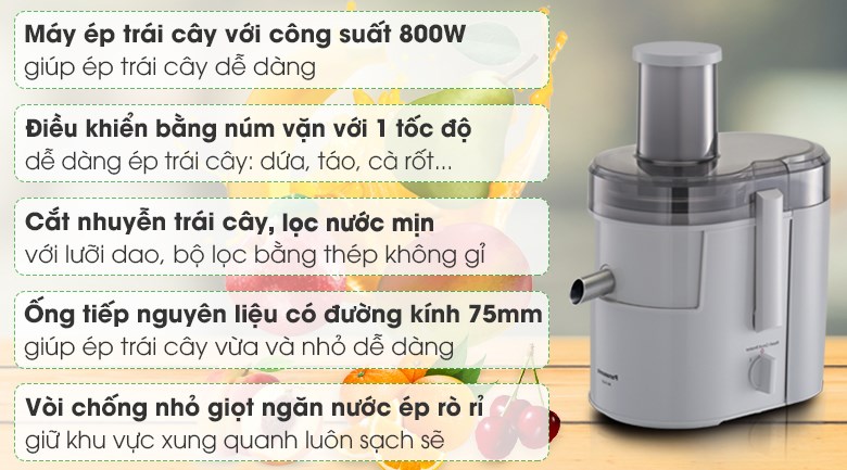 Công suất lớn 800 W ép nhanh, hiệu quả, ép được nguyên quả táo không cần cắt nhỏ.