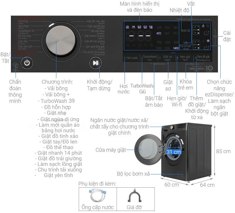 - Tích hợp sẵn nhiều chương trình tiện lợi, bao gồm: TurboWash 39, vải bông, giặt ngừa dị ứng, giặt nhanh 14 phút, giặt nhẹ, đồ hỗn hợp, đồ tinh xảo,… Trong đó, chương trình giặt nhanh 14 phút chỉ phù hợp với những quần áo ít bẩn như vớ, tất, đồ thể thao,… và giặt với số lượng ít, giúp tiết kiệm thời gian.