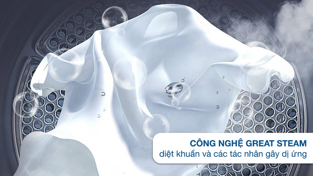 - Công nghệ Great Steam mang đến khả năng diệt khuẩn bám trên quần áo bằng cách sử dụng hơi nước nóng, đồng thời công nghệ này còn loại bỏ nhanh chóng các tác nhân gây dị ứng giúp bảo vệ làn da các thành viên trong gia đình bạn.