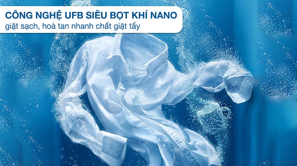 - Công nghệ UFB siêu bọt khí NANO được tích hợp trên máy giặt Inverter mang đến khả năng giặt sạch hiệu quả nhờ các bọt khí nano siêu nhỏ giúp các chất giặt tẩy hòa tan nhanh dễ dàng thấm vào từng sợi vải, loại bỏ các vết bẩn cứng đầu.
