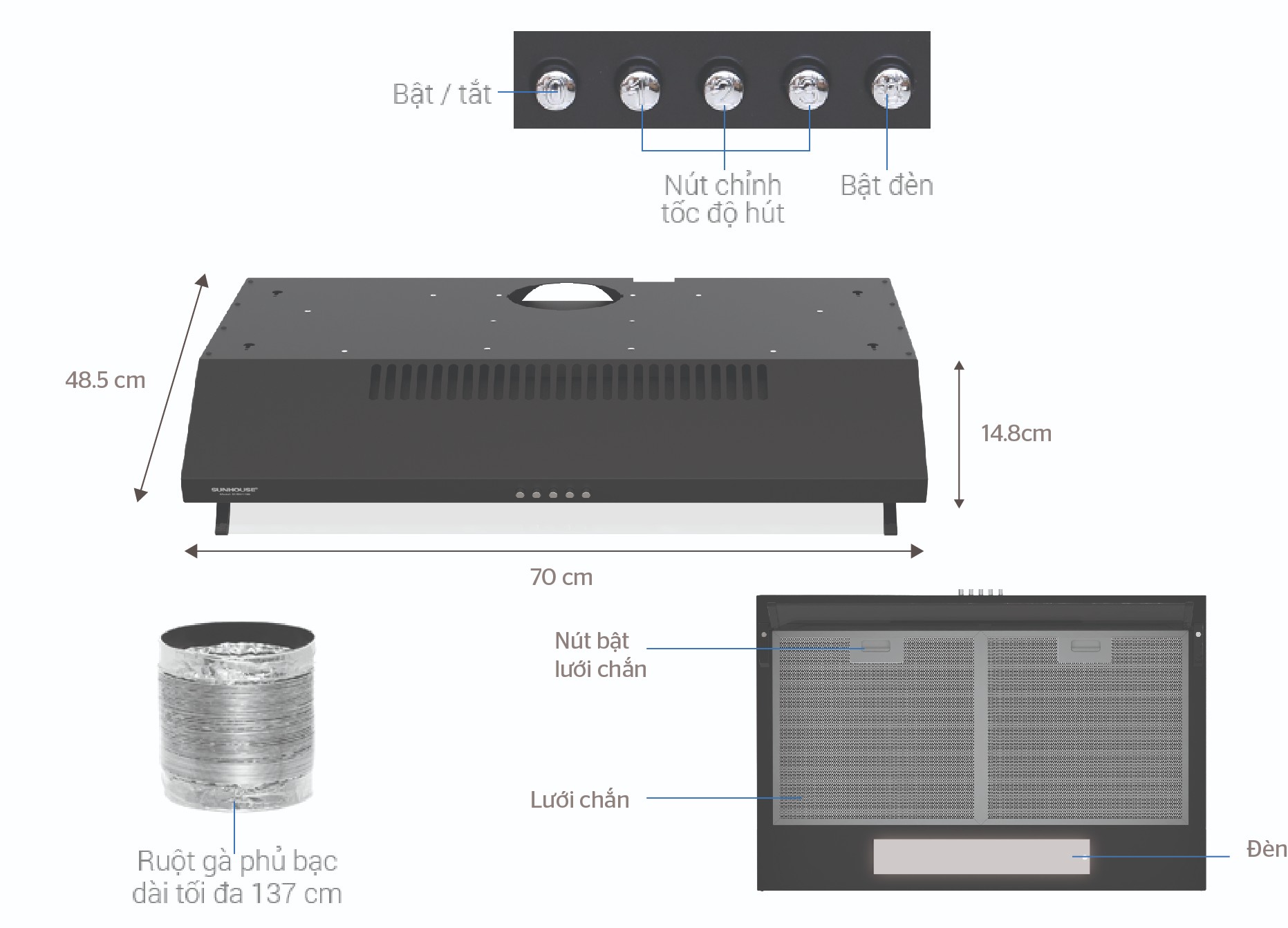 Máy trang bị 2 tấm lưới lọc bằng nhôm dễ dàng tháo lắp và vệ sinh đơn giản, sản phẩm lọc mùi tốt hơn, tuổi thọ cũng cao hơn. Bên cạnh đó, sản phẩm được thiết kế có đèn chiếu sáng công suất lớn giúp hỗ trợ quá trình nấu ăn được dễ dàng hơn.