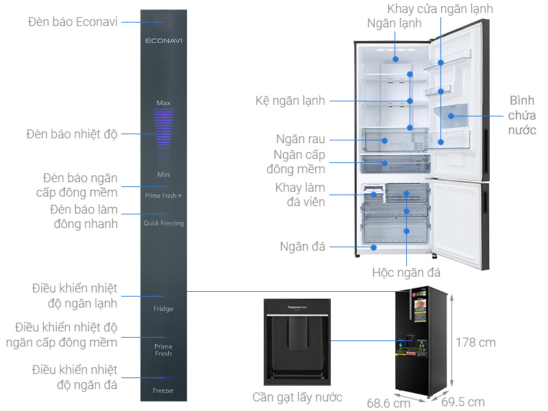 Khay lấy nước ngoài với dung tích 3 lít, sử dụng chất liệu nhựa pha kẽm kháng khuẩn với miếng lọc carbon khử mùi mang đến cho bạn những ly nước mát lạnh, an toàn cho sức khỏe.